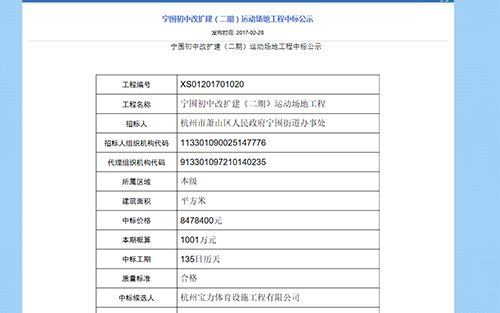 杭州寶力體育設施工程有限公司中標寧圍初中運動場地改建工程。