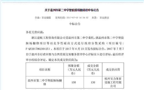 2017年7月10日中標溫州市第二中學塑膠操場翻修公告