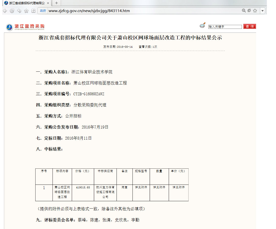 杭州寶力體育中標浙江體育職業技術學院蕭山校區網球場面層改造工程