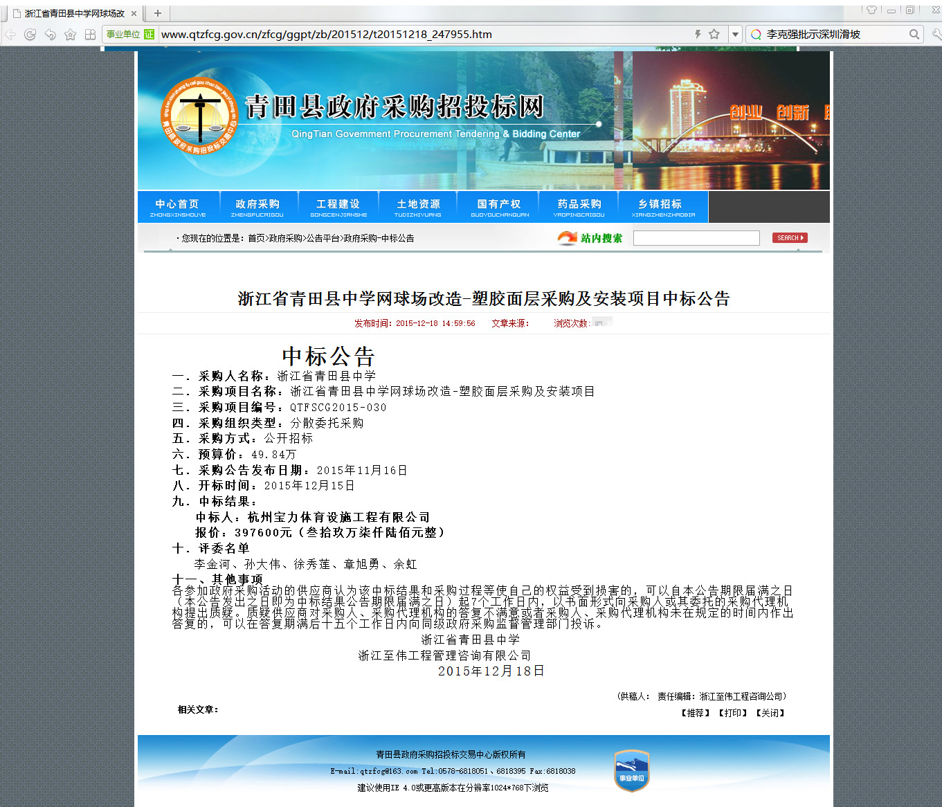 浙江省青田縣中學網球場改造-塑膠面層采購及安裝項目中標