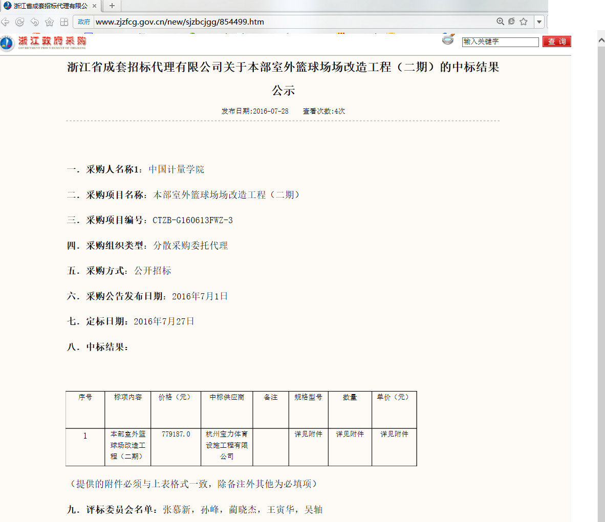 2016年7月27日中標中國計量大學本部室外籃球場場改造工程(二期)