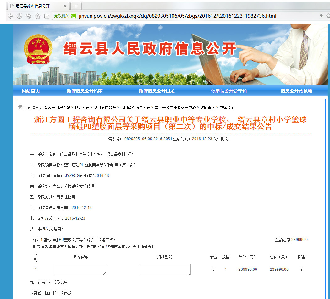2016年12月23日中標縉云縣職業中等專業學校、 縉云縣章村小學籃球場硅PU塑膠面層等采購項目(第二次)